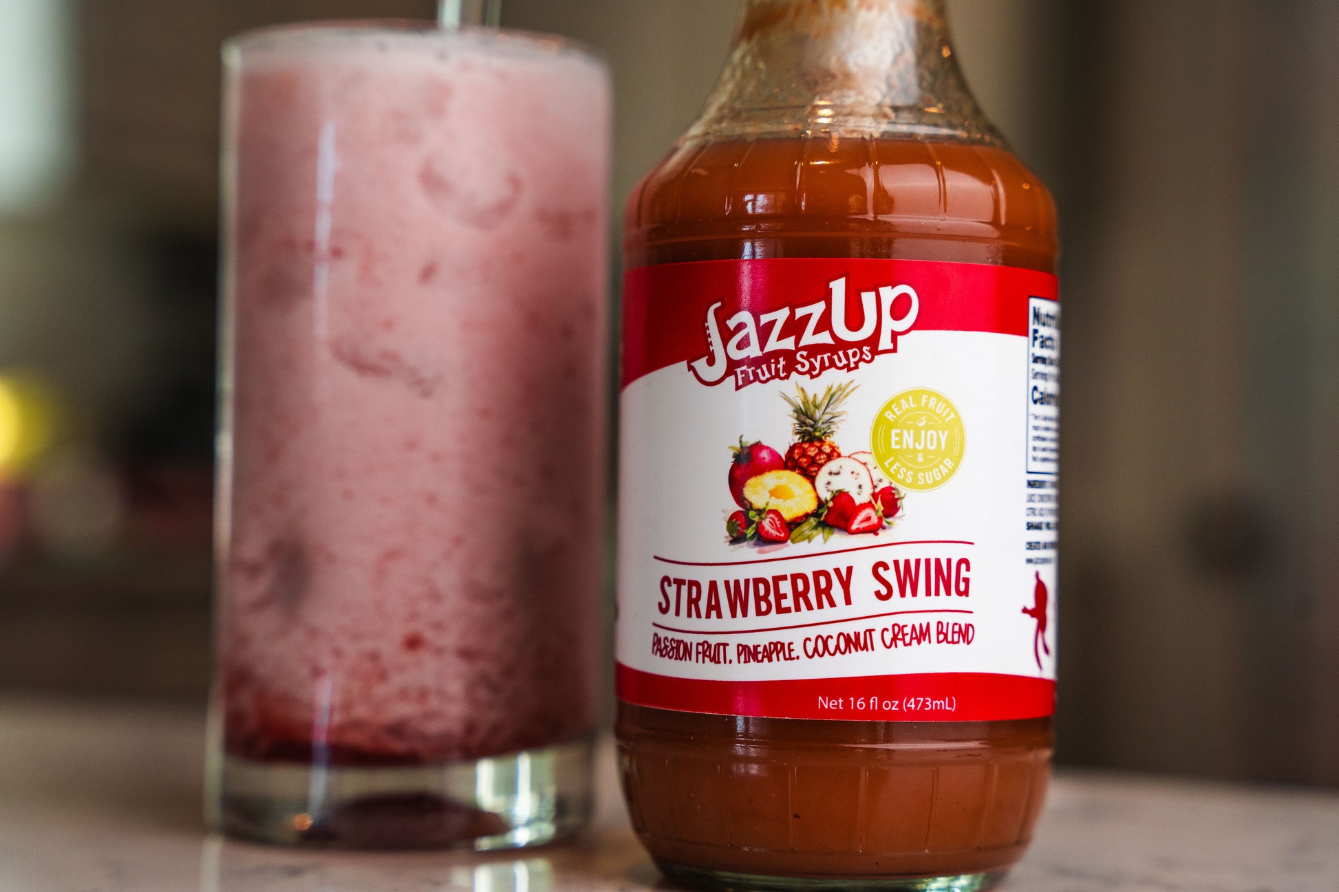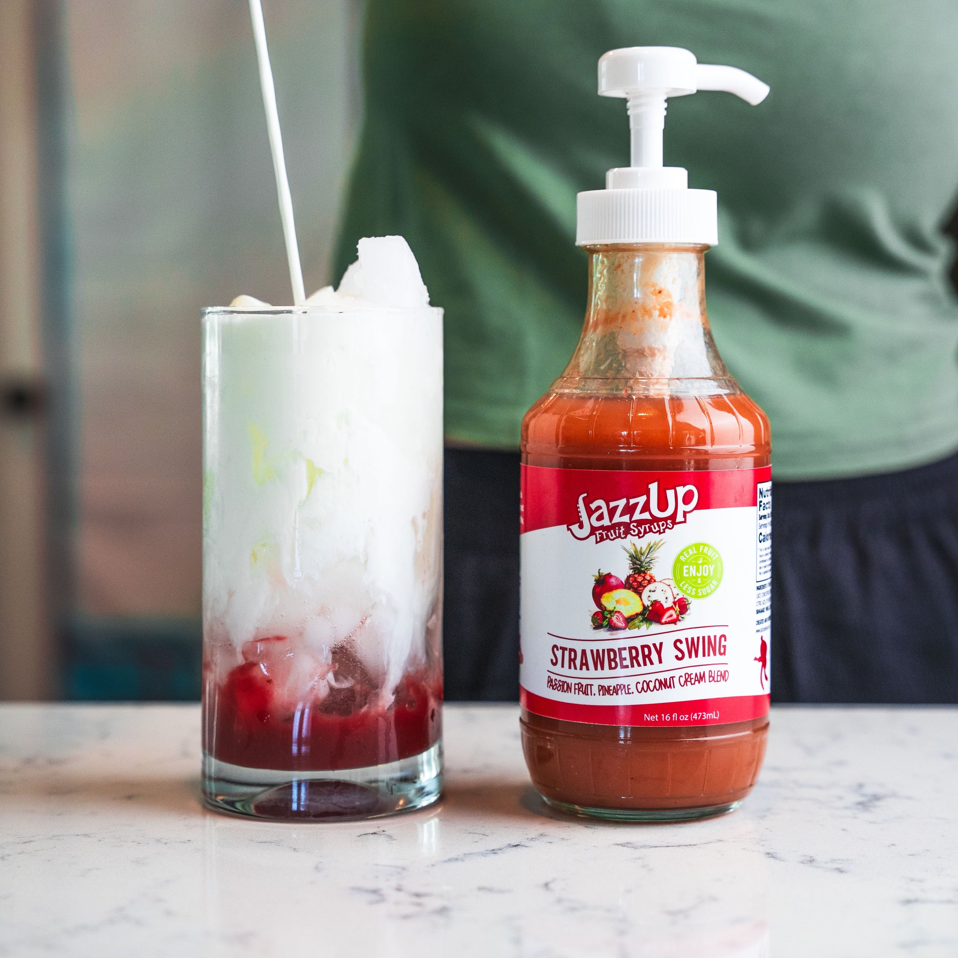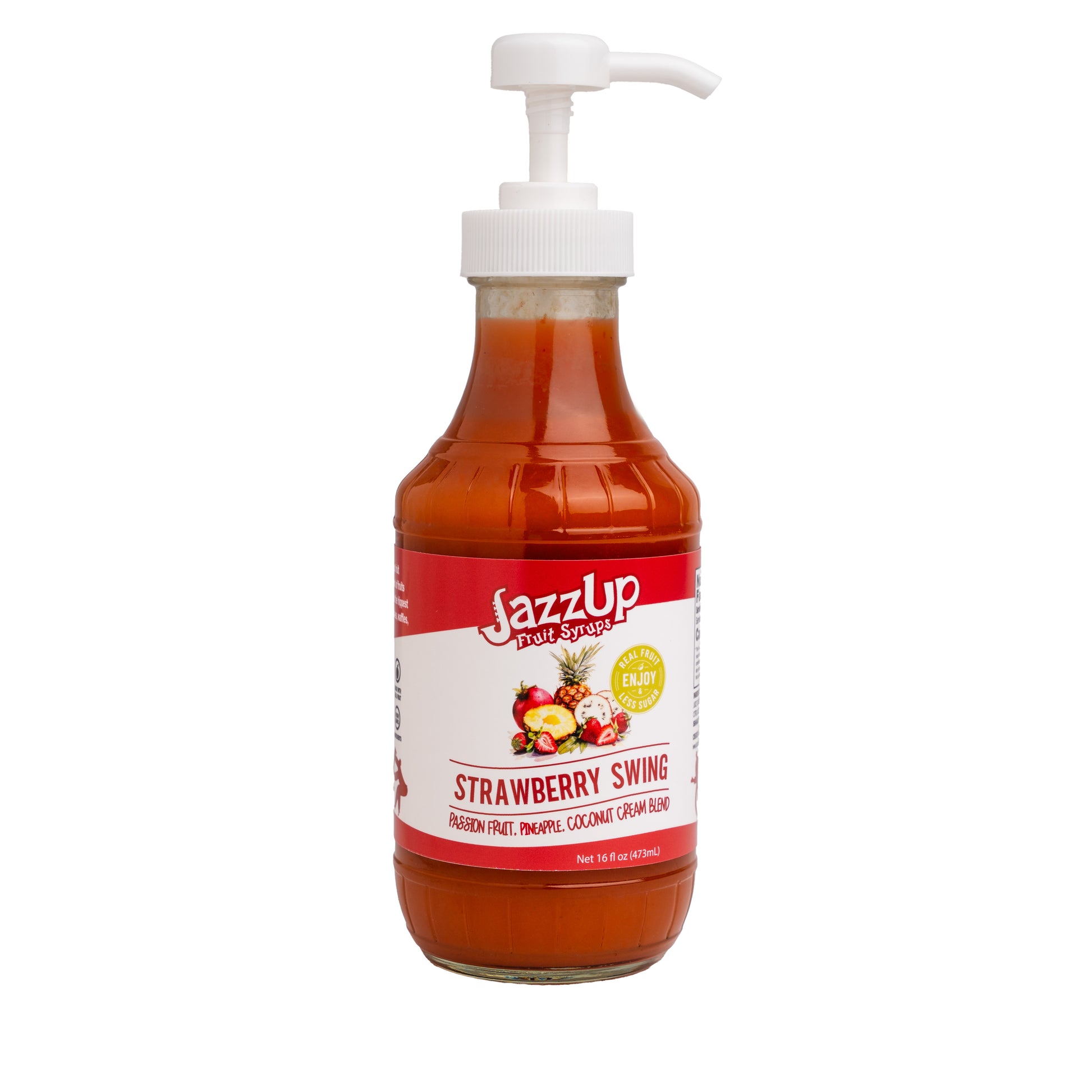 JazzUp® Strawberry Swing Fruit Syrup and Drink Mixer - Less Sugar & Real Fruit Puree for Pancake, Italian Soda, Smoothie, and Beverage Mixing - 16 fl oz (Real Fruit: Strawberry Puree, Passionfruit, Pineapple Juice, Coconut Cream)